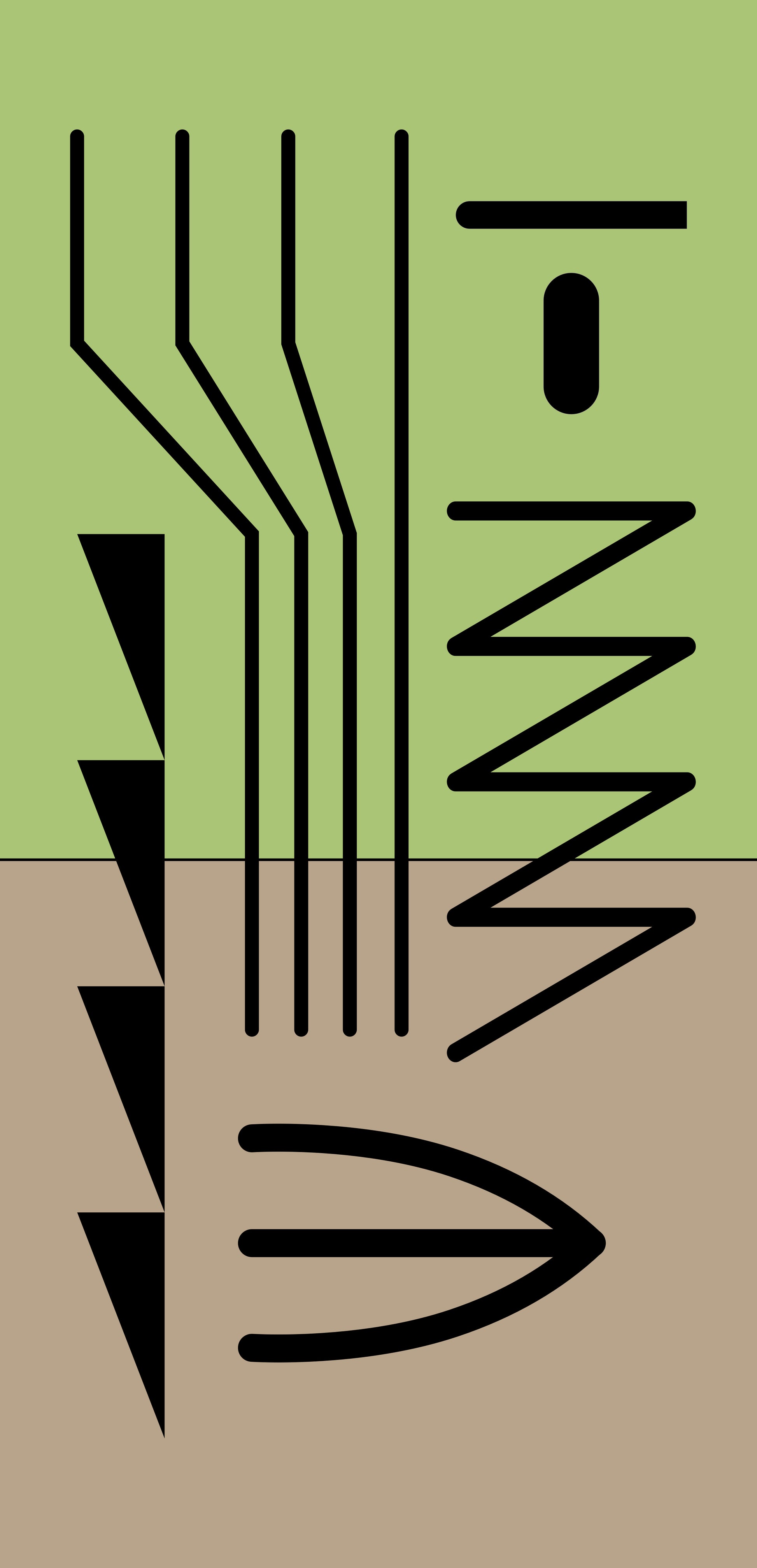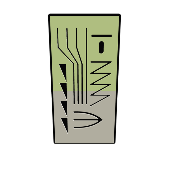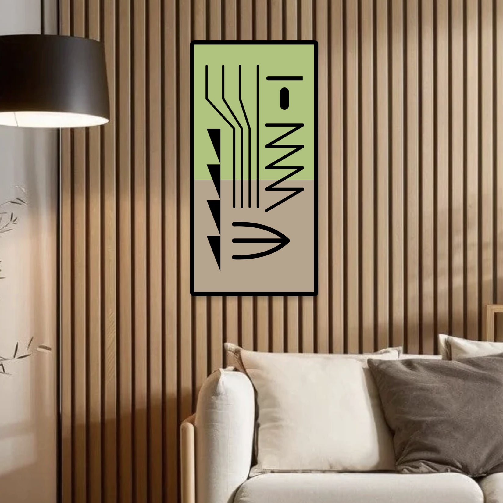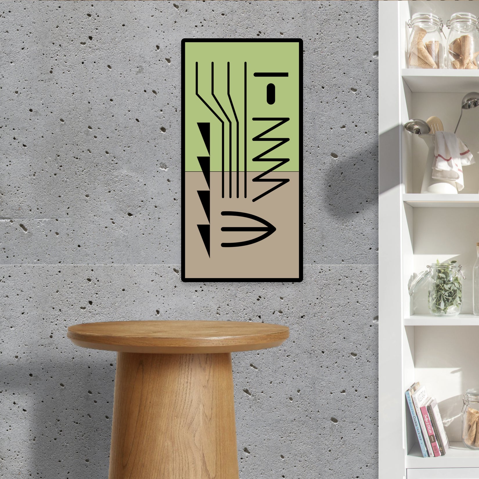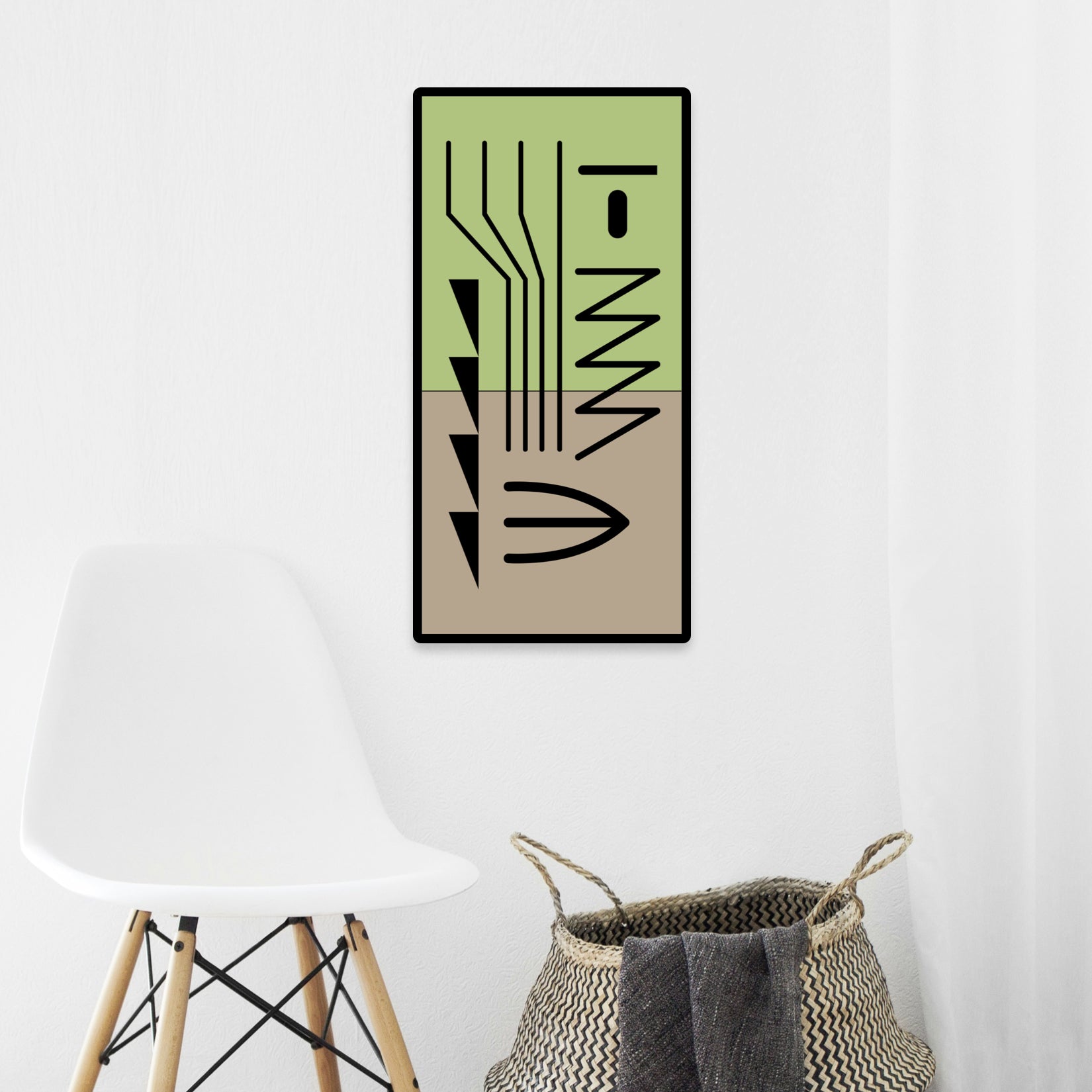 The top section, bathed in a soothing green, symbolizes the harmony of nature, juxtaposed with sleek black lines that curve and angle sharply, representing the structured chaos of modern technology. The singular black dot and bar hint at an eye and a visor, evoking the essence of a futuristic guardian. Below, the soft, earthy beige ground stabilizes the panel, while the zigzag patterns and linear designs speak to the constant flux and dynamic energy of the cyber world. This piece isn’t just art; it’s a dialogue between the past and the future, inviting viewers to explore the balance of life and technology.