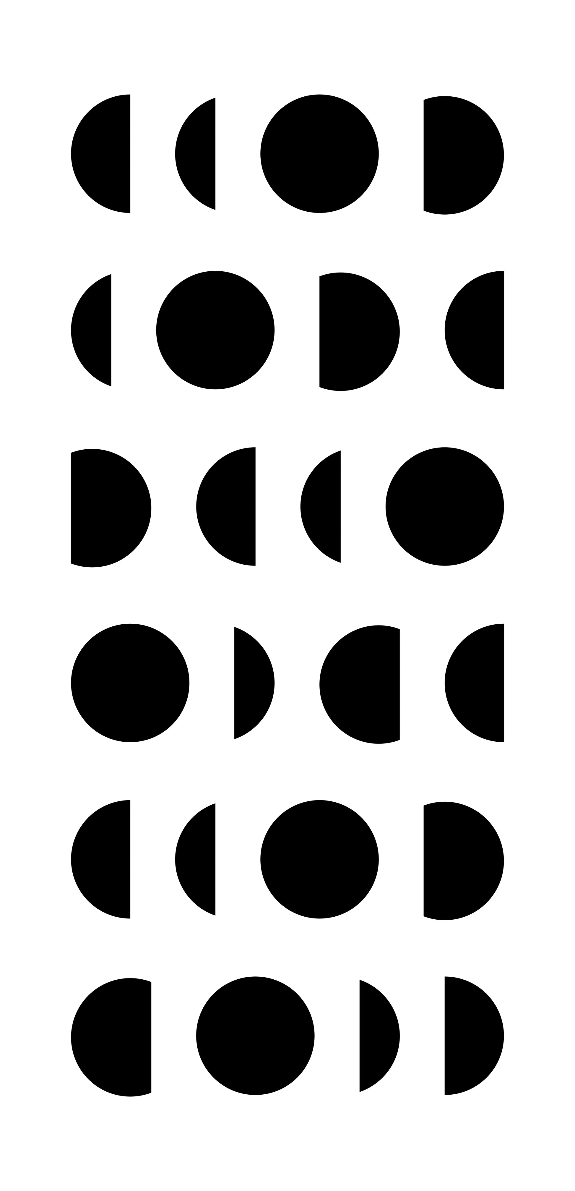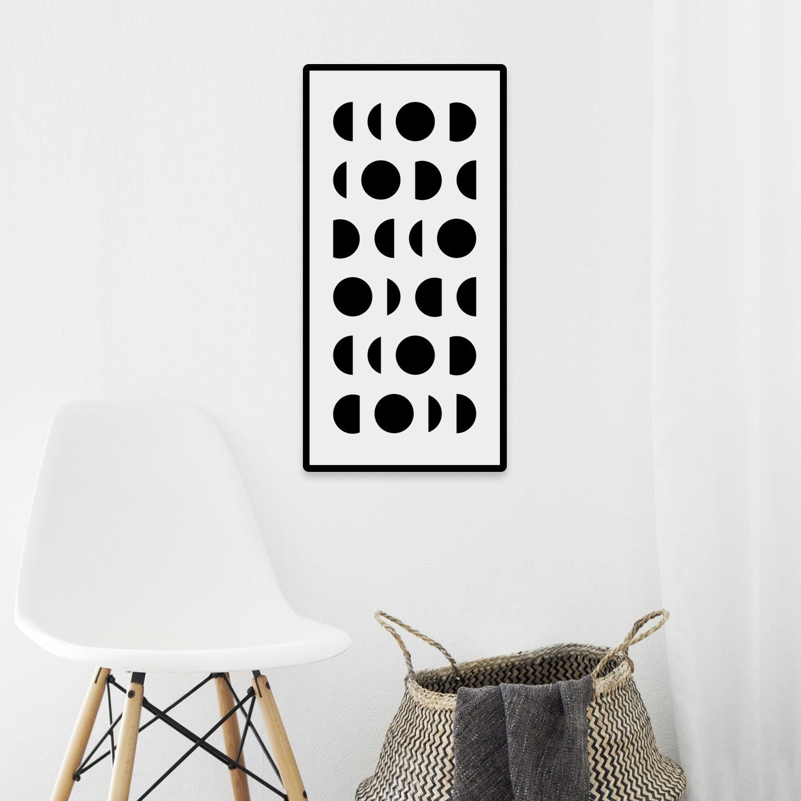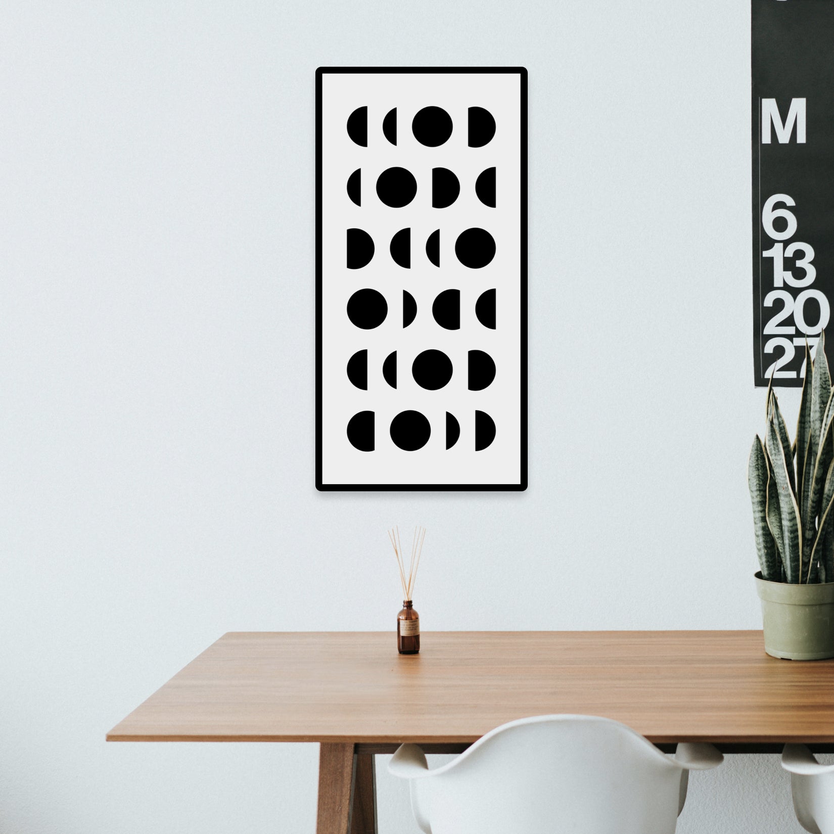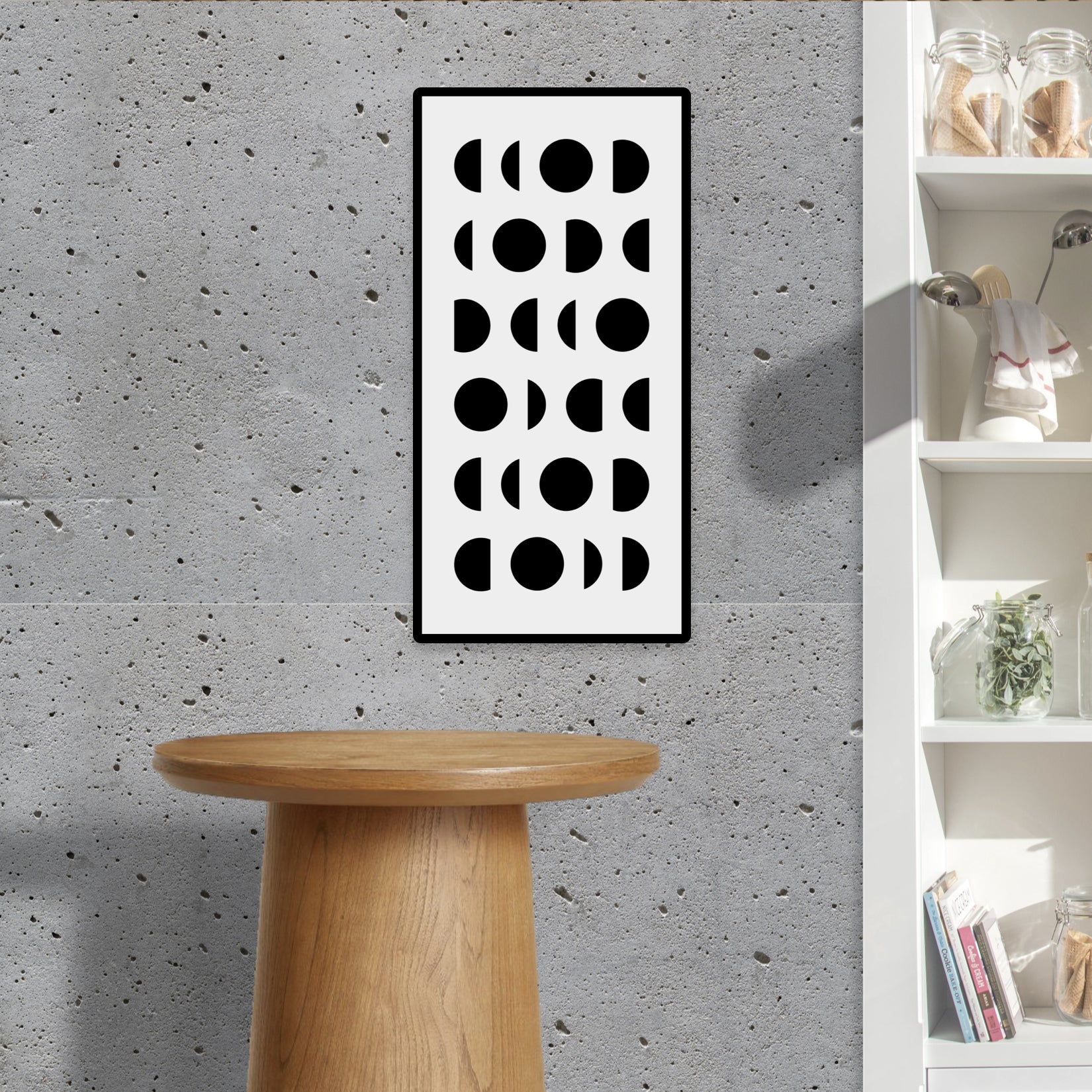 The pattern consists of a series of black semicircles and ovals set against a pristine white background, reminiscent of the moon’s journey across the night sky. Each shape symbolizes different phases, from the delicate crescent to the bold full moon, creating a rhythmic visual experience. The orderly arrangement of these elements evokes a sense of harmony and balance, much like the predictable cycles of the moon. This piece invites you to reflect on the passage of time and the silent, steady movements of celestial bodies, bringing a touch of the cosmos into your space.