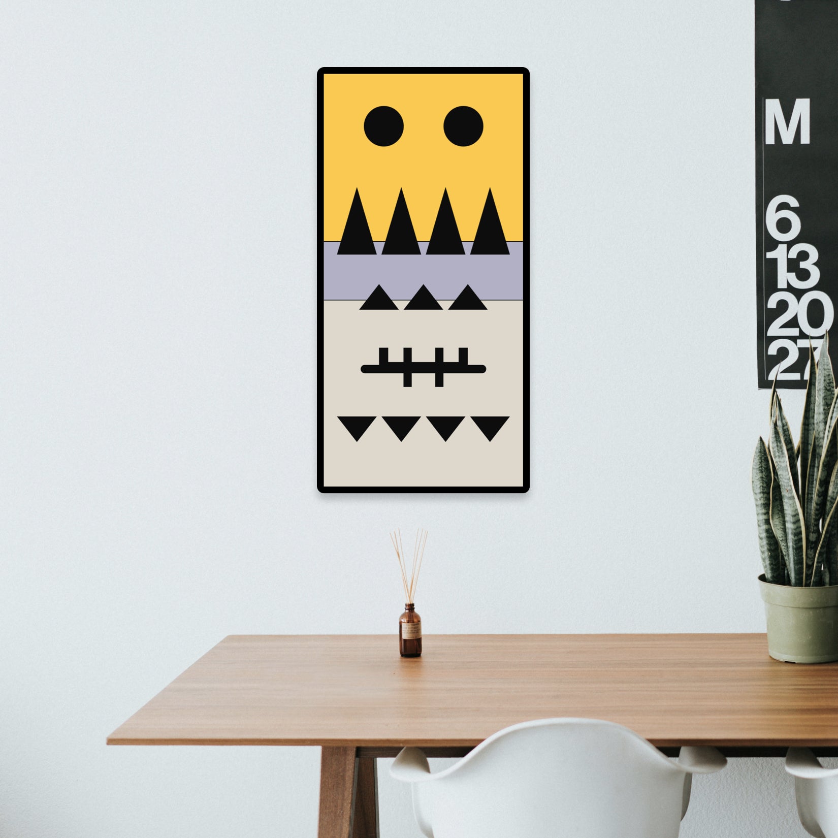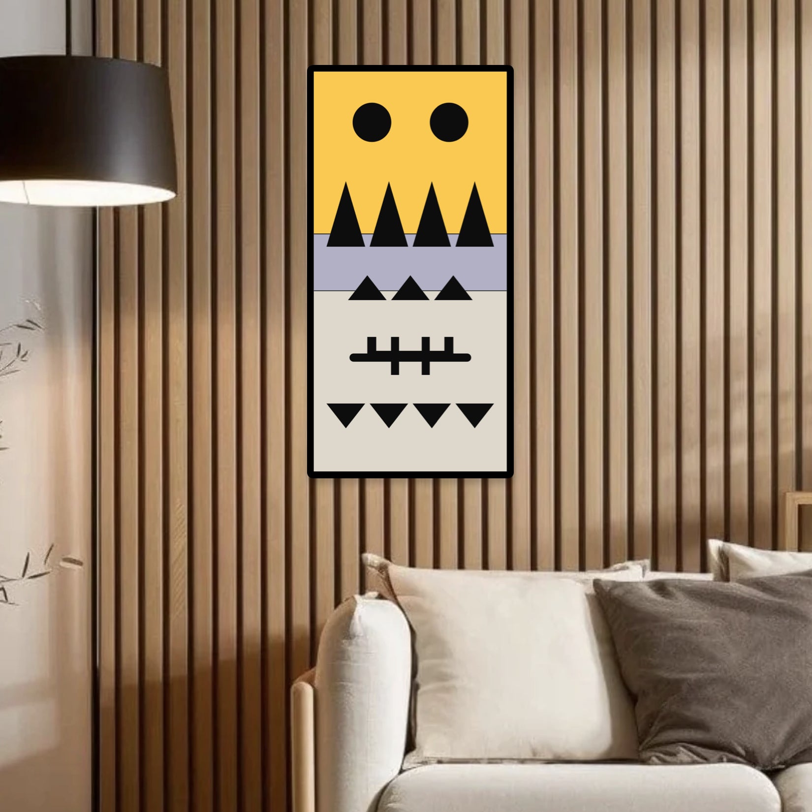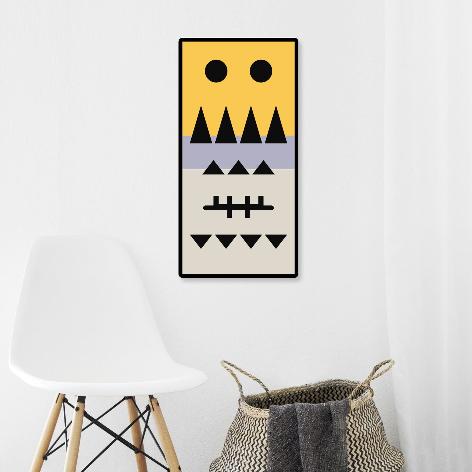 The top section features two large black circles, resembling curious eyes, watching over your space with a gentle presence. Below, a row of sharp, upward-pointing triangles in black could be seen as mountains or the peaks of challenges overcome. The middle section, with its smaller triangles, represents the little victories and daily triumphs. The intersecting lines in the lower middle section hint at a form of ancient tally marks, a nod to the stories and records this panel ‘keeps’. Finally, the bottom row of downward-pointing triangles mirrors the peaks above, grounding the piece in balance and symmetry.