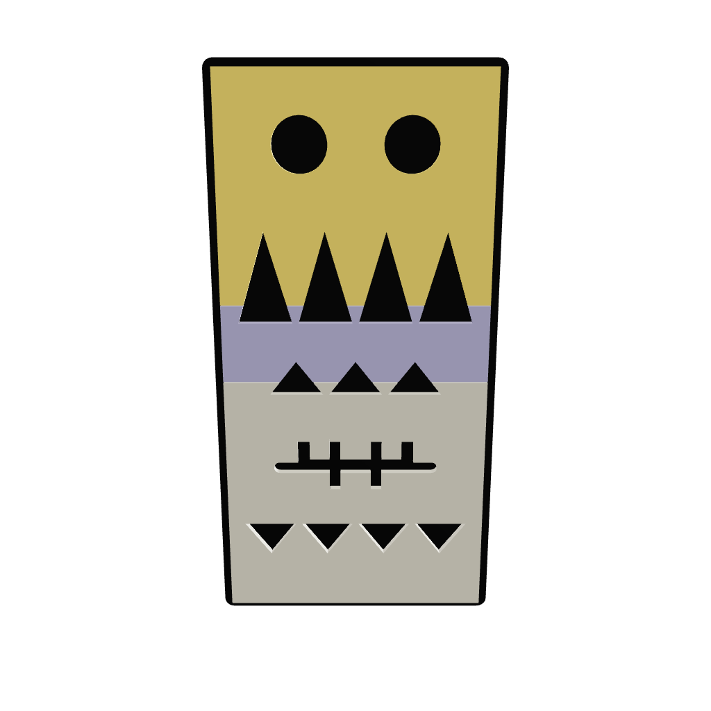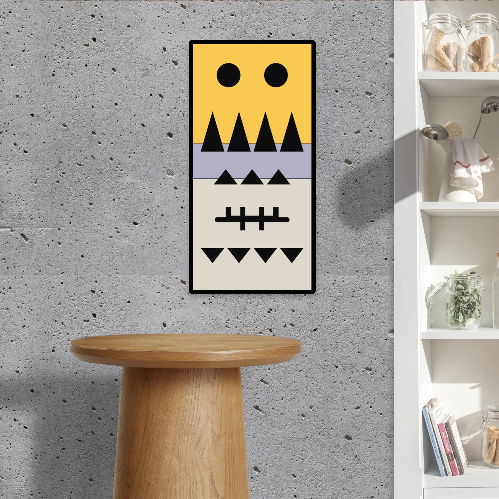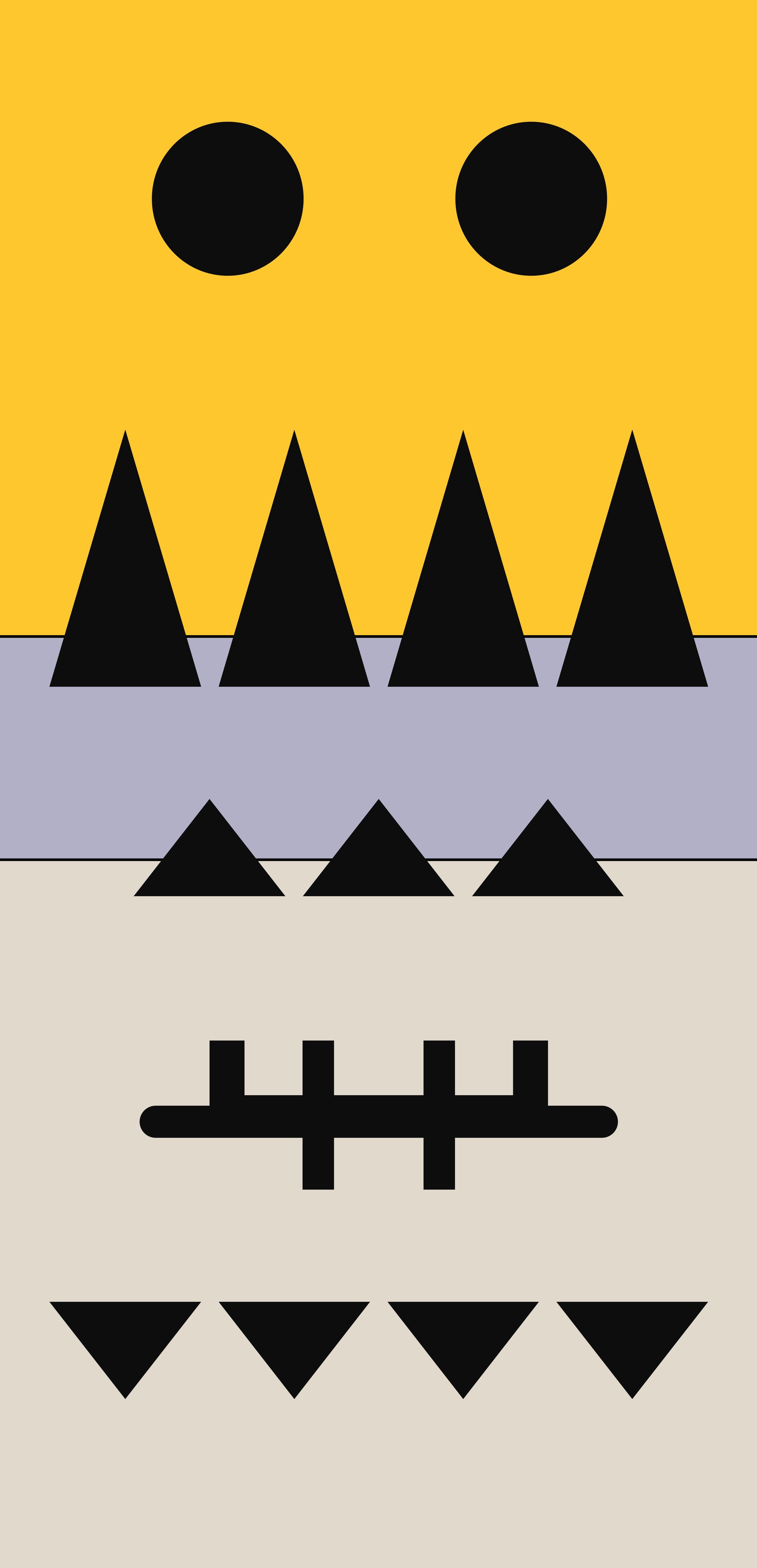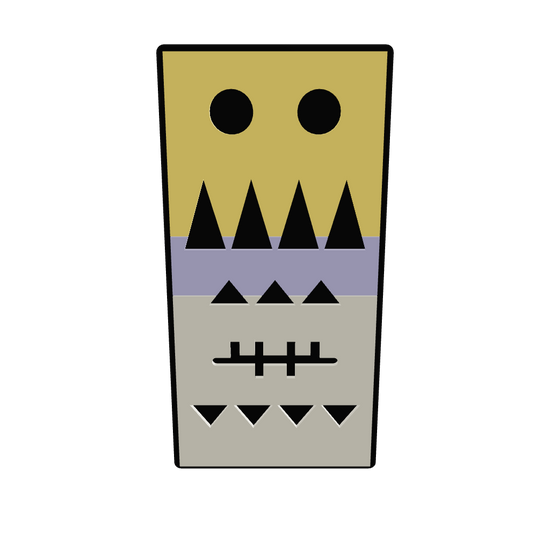 The top section features two large black circles, resembling curious eyes, watching over your space with a gentle presence. Below, a row of sharp, upward-pointing triangles in black could be seen as mountains or the peaks of challenges overcome. The middle section, with its smaller triangles, represents the little victories and daily triumphs. The intersecting lines in the lower middle section hint at a form of ancient tally marks, a nod to the stories and records this panel ‘keeps’. Finally, the bottom row of downward-pointing triangles mirrors the peaks above, grounding the piece in balance and symmetry.